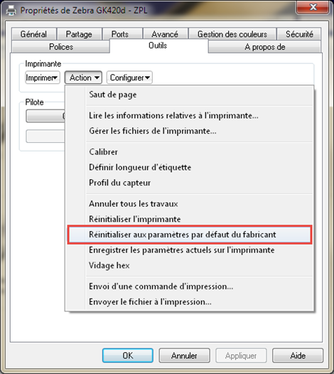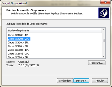 - Sélectionner ZEBRA GK420d-ZPL