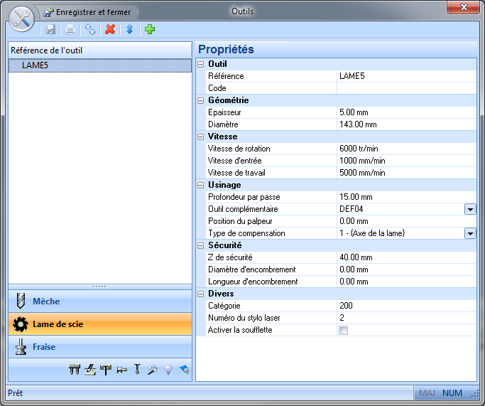 Indiquer la Profondeur de travail maximum d'usinage pour cette lame