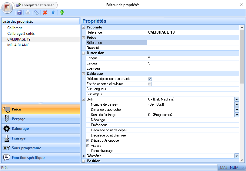 Dans les propriétés onglet Pièce, il faut créer une fonction avec le nom du CALIBRAGE + EPAISSEUR : Exemple CALIBRAGE 19 . Indiquer dans cette propriété les besoins spécifiques liés au calibrage de l'épaisseur.